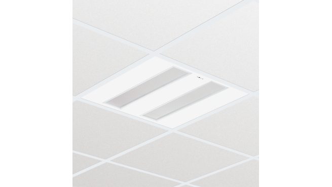 625x625 mm, Visible profile ceiling version, Oțel, Alb, Alb semnal (RAL9003), Sistem Interact cu reglarea intensității luminoase Dali, compatibil extern cu iluminat central de urgență, 3600 lm, 38 W, 95 lm/W, 4000 K, (0.38, 0.37) SDCM ≤3, CRI>90, UGR19, Fascicul luminos larg, Sistem optic cu micro-lentile, Policarbonat, IP20/40 | Protejat împotriva contactului cu degetele; protejat împotriva contactului cu cablurile, IK02 | 0,2 J standard, Clasa de siguranță I, Conector push-in cu eliberare a tragerii, Iluminat central de urgență acționat de curent continuu