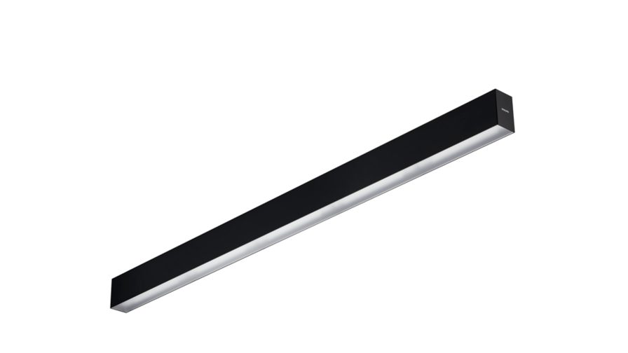1410x55 mm; H88 mm, Aluminiu, Negru, Negru semnal (RAL9004), Suprafață, Sistem Interact cu reglarea intensității luminoase Dali, compatibil extern cu iluminat central de urgență, 3100 lm, 22 W, 148 lm/W, 4000 K, (0.38, 0.38) SDCM <3, CRI>90, UGR19, Fascicul luminos larg, Jivrat, Polimetil metacrilat, IP20 | Protejat împotriva contactului cu mâna, IK03 | 0,35 J ranforsat, Clasa de siguranță I, Conector push-in cu 5 pini, Iluminat central de urgență acționat de curent continuu